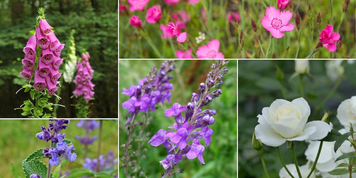 Les linaires s’intègrent bien dans les jardins romantiques, notamment en compagnie de rosiers. Ici, Digitalis purpurea (photo Matthijs van den Berg), Dianthus deltoides, Nepeta cataria (photo JLPC), Linaria purpurea (photo Gailhampshire), Rosier ‘Iceberg’