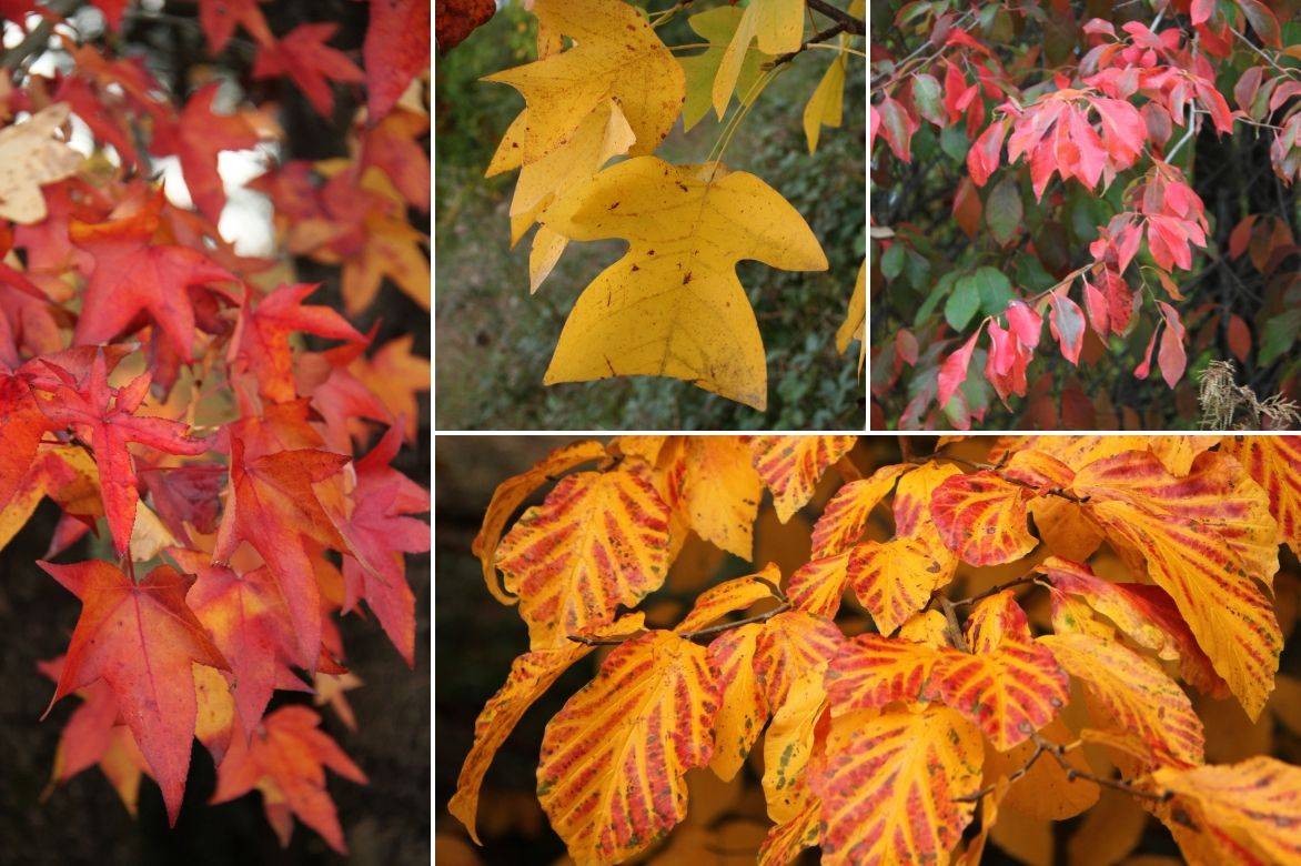 Un exemple d’association automnale en bosquet : Liquidambar styraciflua, Liriodendron tulipifera, Nyssa sylvatica et Parrotia persica