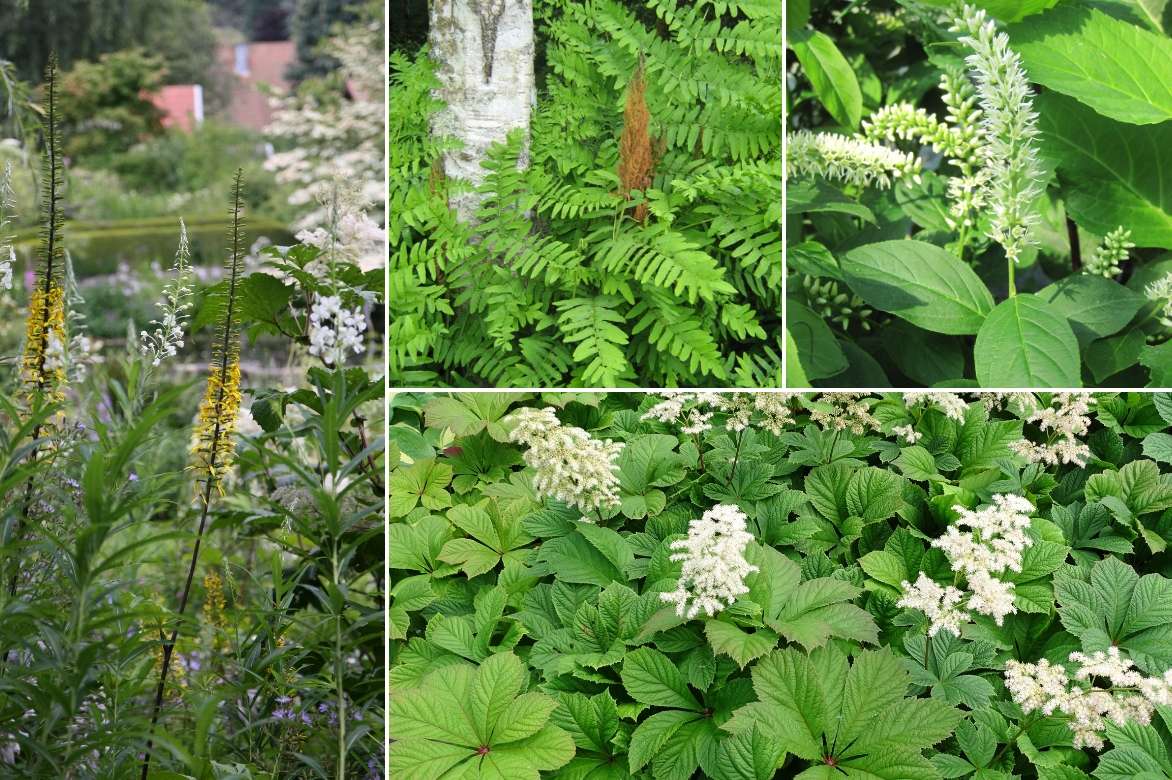 Un exemple d’association sur une berge humide : Ligularia przewalskii et Epilobium angustifolium ‘Album’, Osmunda regalis (photo Rhian), Itea virginica, Rodgersia aesculifolia ‘Irish Bronze’