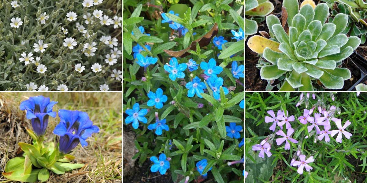 Les lithodoras s’intègrent facilement dans une rocaille, avec d’autres plantes adaptées aux terrains caillouteux et secs. Cerastium tomentosum (photo Krzysztof Golik), Gentiana acaulis, Lithodora diffusa ‘Heavenly Blue’ (photo Meneerke bloem), Saxifraga cotyledon ‘Southside Seedling’, et Phlox subulata (photo Meneerke bloem)