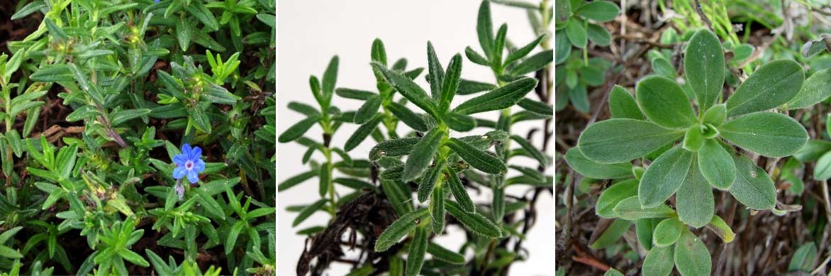 Le feuillage des Lithodora diffusa ‘Heavenly Blue’ (photo Dinkum), Lithodora ‘Cambridge Blue’, et Lithodora oleifolia (photo Guérin Nicolas