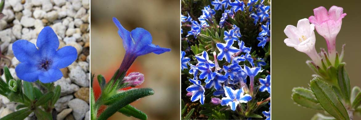 La floraison des Lithodora diffusa (photo KENPEI), Lithodora prostrata (photo Pancrat), Lithodora diffusa ‘Star’, et Lithodora hispidula (photo Zeynel Cebeci)