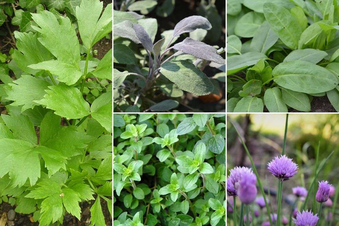 Un exemple d’association avec d’autres plantes aromatiques : Livèche, sauge officinale, oseille-épinard, origan (marjolaine) et ciboulette