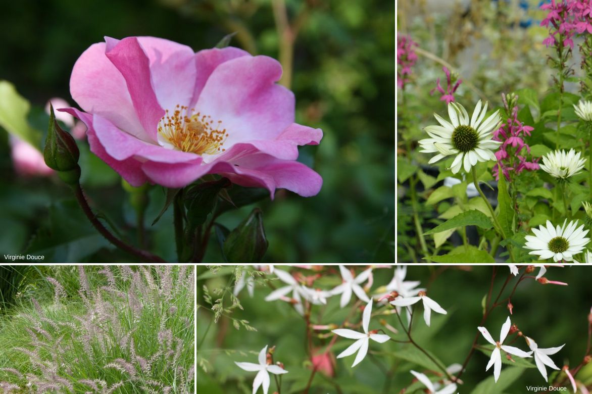Une idée d’association : rosier ‘Rosy Cushion’, Lobelia ‘Monet Moment’, Echinacea purpurea ‘Virgin’, Pennisetum orientale, Gillenia trifoliata.