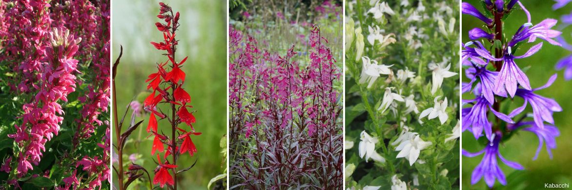 Plusieurs couleurs de fleurs : Lobelia ‘Monet Moment’, Lobelia fulgens ‘Queen Victoria’, Lobelia ‘Russian Princess’, Lobelia siphilitica ‘Alba’, Lobelia sessilifolia.