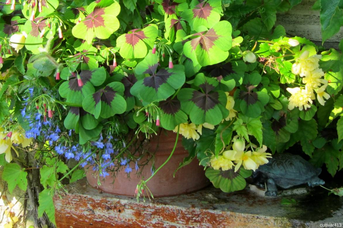 Un exemple d’association pour une belle potée estivale : Lobelia ‘Magadi Electric Blue’ (proche de la variété ‘Hot Water Blue’), Oxalis deppei et Begonia tuberosa ‘Breezy Yellow’.