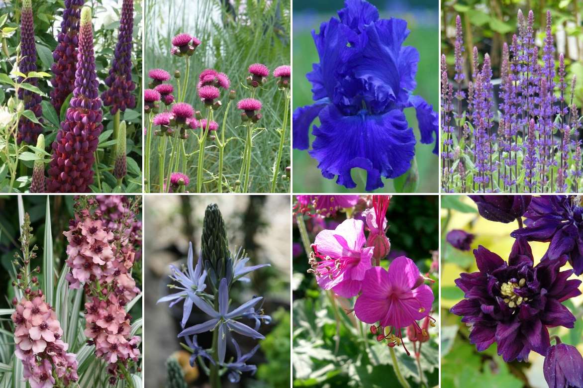 Une idée d’association : Lupinus ‘West Country Masterpiece’, Cirsium rivulare ‘Atropurpureum’, Iris germanica ‘Blue Crusader’, Salvia nemorosa ‘Caradonna’, Verbascum ‘Southern Charm’, Camassia leichtlinii ‘Caerulea’, Geranium macrorrhizum ‘Bevan’s Variety’ et Aquilegia ‘Clementine Dark Purple’