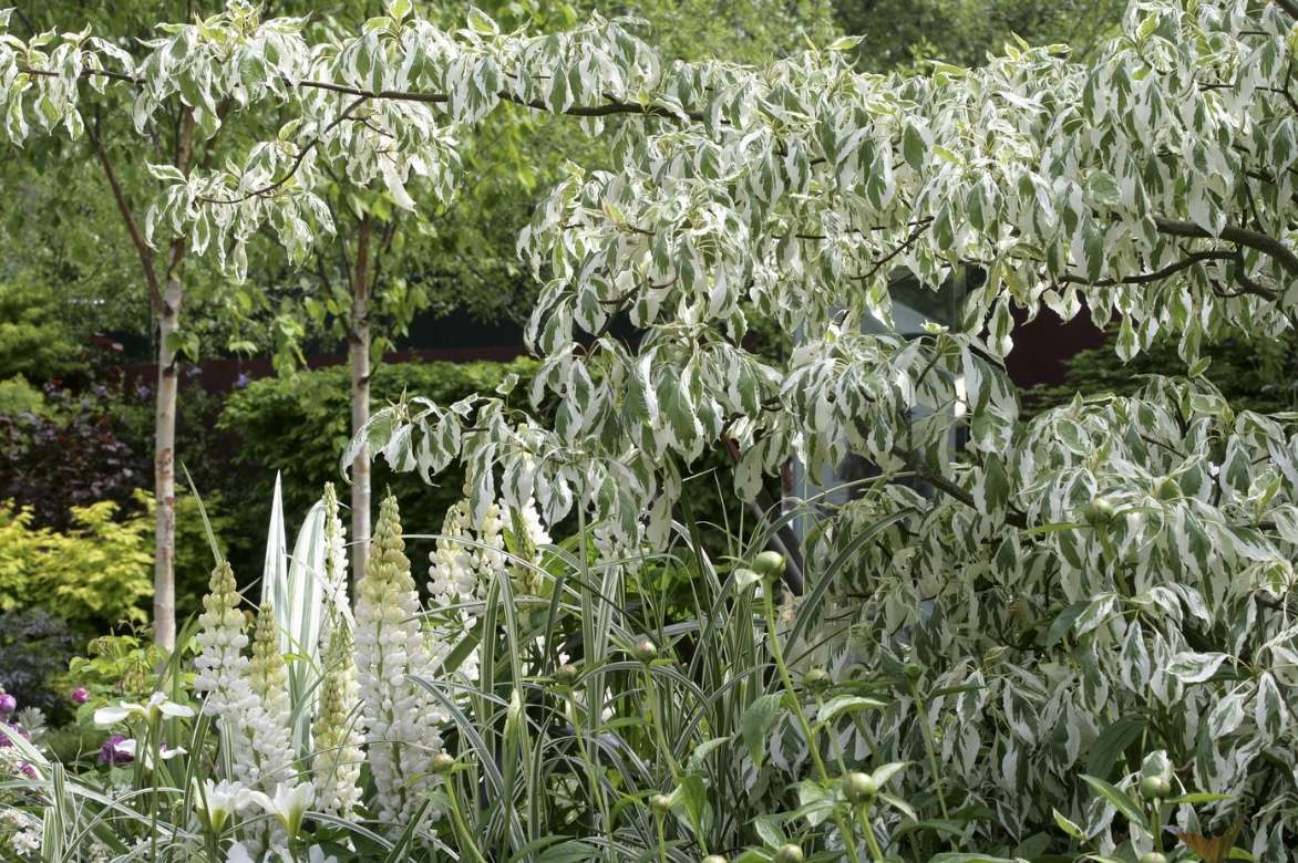 Un exemple d’association ton sur ton : Cornus controversa ‘Variegata’, Lupinus ‘La Demoiselle’, Miscanthus sinensis ‘Rigoletto’ (variété proche de ‘Morning Bright’ ou ‘Variegatus’) / Paysagiste Yvonne Innes – Credit photo Nicole et Patrick Mioulane /
