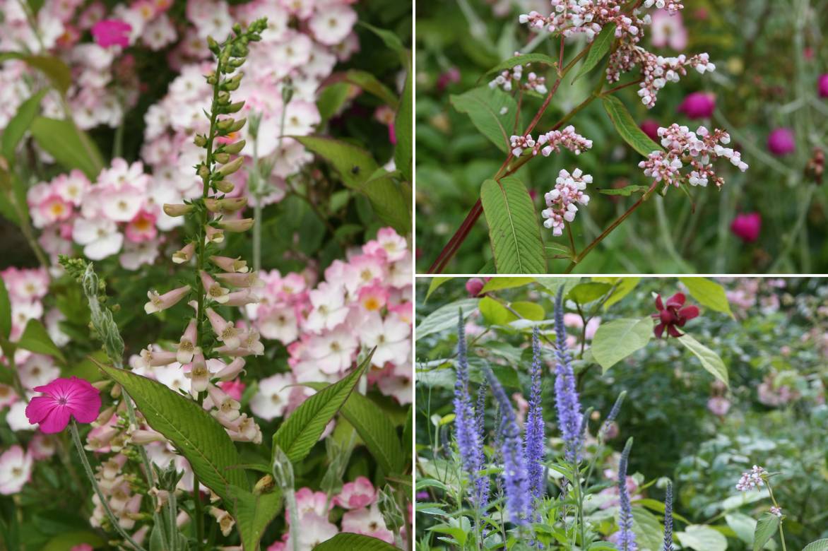 Un exemple d’association : rosier ‘Ballerina’, Lychnis coronaria, Digitalis ‘Glory of Roundway’, Persicaria campanulata, Veronica longifolia ‘Blauriesin’ (Photos Virginie Douce).