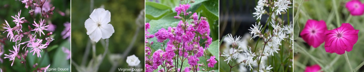 Quelques fleurs de Lychnis : L. flos-cuculi, L. coronaria ‘Alba’, L. viscaria ‘Plena’, L. flos-cuculi ‘White Robin’, L. coronaria.