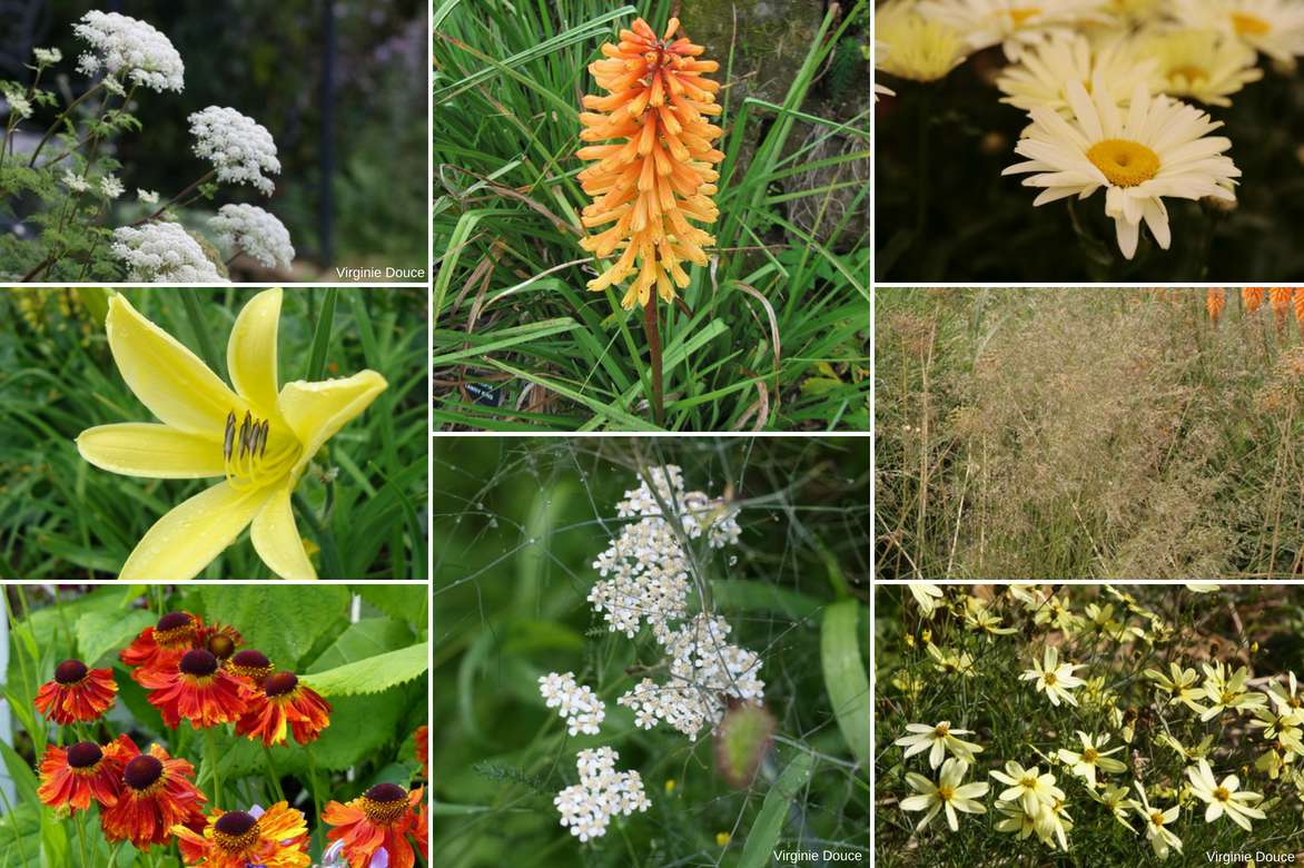 Un exemple d’association naturelle aux couleurs chaudes : Selinum wallichianum, Hemerocallis ‘Citrina’, Helenium ‘Moerheim Beauty’, Kniphofia ‘Tawny king’, Achillea millefolium ‘Heinrich Vogeler’ et Foeniculum vulgare ‘Giant Bronze’, Leucanthemum ‘Banana Cream’, Deschampsia cespitosa ‘Bronzeschleier’, Coreopsis verticillata ‘Moonbeam’.