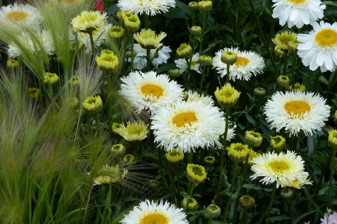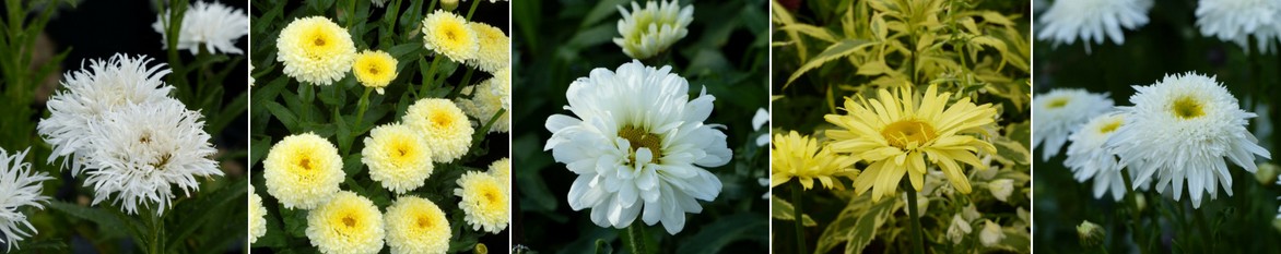 Fleurs de marguerites : Leucanthemum ‘Aglaia’, Leucanthemum ‘Luna’ (Copyright Terra Nova Nurseries), Leucanthemum ‘Victorian Secret’, Leucanthemum ‘Goldfinch’, Leucanthemum superbum ‘Wirral Supreme’.