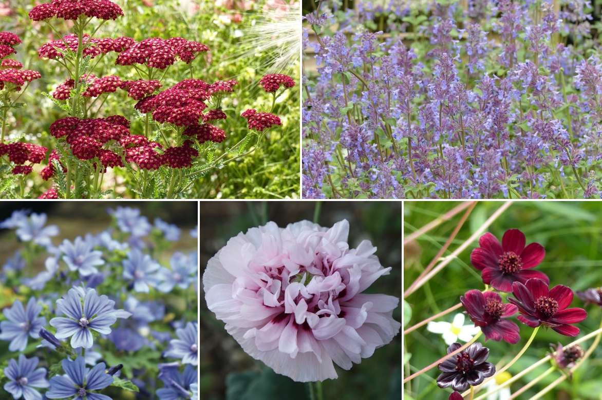 Un exemple d’association : Achillea millefolium ‘Red Velvet’, Nepeta ‘Six Hills Giant’, Malva sylvestris ‘Primley Blue’, Papaver somnifeum, Cosmos atrosanguineus ‘Chocamocha’