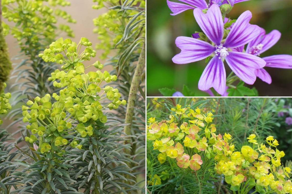 Une idée d’association contrastée : Malva sylvestris, Euphorbia characias ssp wulfenii, Euphorbia cyparissias ‘Orange Man’ (ou ‘Fens Ruby’ conviendrait parfaitement aussi)