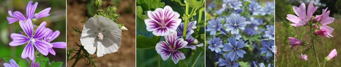 Quelques fleurs de mauves : Malva sylvestris, Malva moschata ‘Alba’, Malva sylvestris ‘Zebrina’, Malva sylvestris ‘Primley Blue’, Malva moschata ‘Rosea’