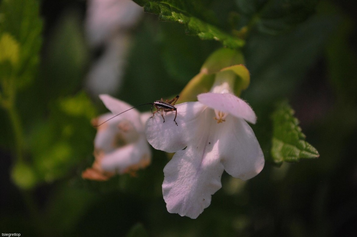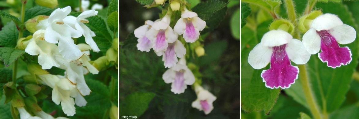 Les fleurs inclinées du même côté sont réunies par groupes de deux à six à l’aisselle des feuilles supérieures. D’abord tubulaires, elles s’épanouissent en une corolle bilabiée de 2 à 4 cm de long divisée en 4 lobes enchâssés dans un calice campanulé et poilu. La lèvre supérieure est dressée et délicatement découpée en 3 petites dents, l’inférieure se divise en 3 lobes étalés. Chacune de ces petites fleurs somptueuses d’un blanc pur ou blanches à lèvre inférieure rose ou ponctuée de mauve, laisse s’échapper un bouquet d’étamines saillantes aux anthères jaunes.