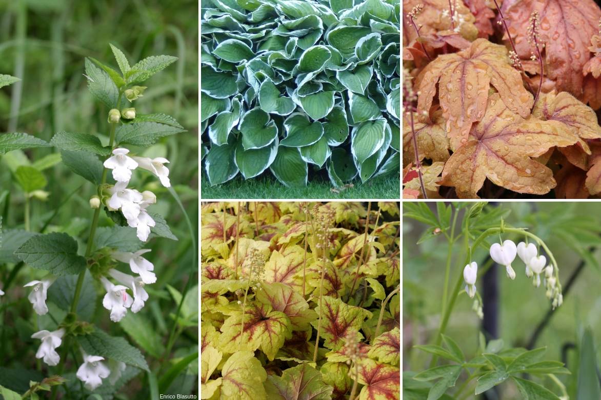 Une idée d’association en zone ombragée : Melittis melissophyllum ‘Alba’, Hosta fortunei ‘Francee’, Heucherella ‘Sweet Tea’, Heucherella ‘Stoplight’ et Dicentra spectabilis ‘Alba’ (syn. Lamprocapnos spectabilis ‘Alba’)
