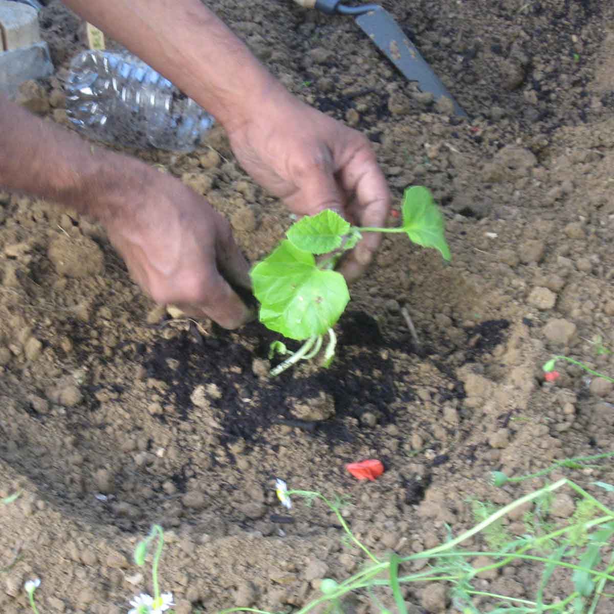 - Placer le plant de melon et ramener la terre, le collet ne doit pas être enterré.
