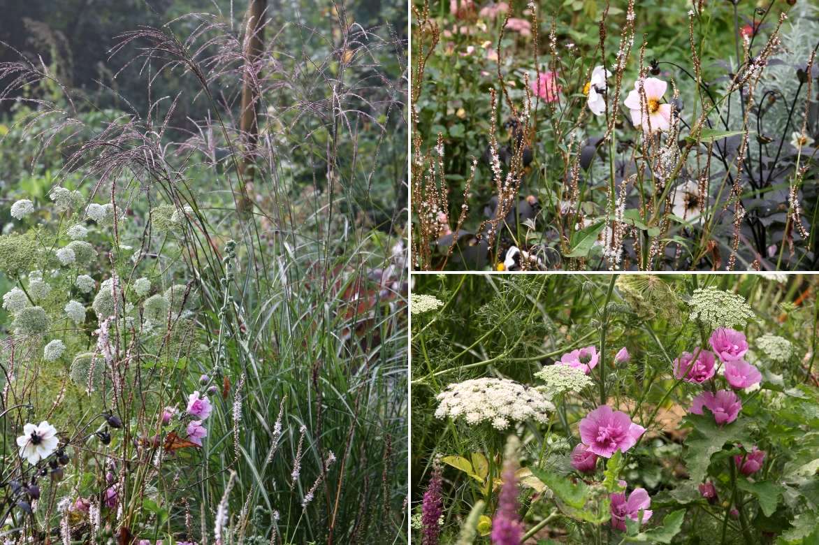 Un exemple d’association naturelle : Miscanthus sinensis ‘Purple Fall’ (variétés proches ‘Dronning Ingrid’ ou ‘Ferner Osten’), Persicaria amplexicaulis ‘Alba’, Dahlia ‘Twinning’s After Eight’, Amni visnaga, Alcalthaea ‘Parkrondell’ (la variété ‘Parkallee’ conviendrait très bien aussi)
