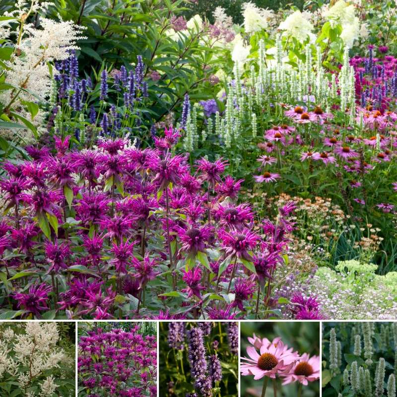 Un exemple d’association opulente en mixed-border : Monarda ‘Scorpion’, Persicaria polymorpha, Echinacea purpurea, Agastache ‘Black Adder’, Agastache rugosa ‘Alabaster’.