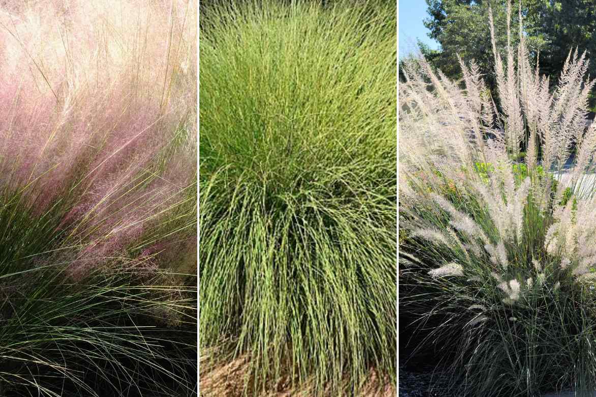 - Muhlenbergia capillaris (Herbe aux cheveux roses) : la plus populaire pour ses inflorescences vaporeuses roses.