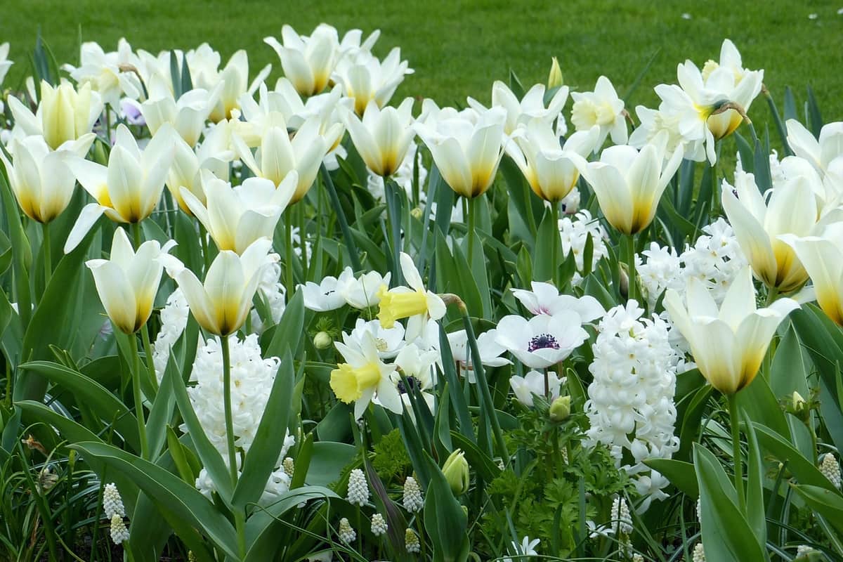 Une jolie association de fleurs blanches avec les narcisses ‘Mount Hood’, tulipes ‘Concerto’, jacinthes ‘Carnegie’, muscaris ‘White Magic’ et anémones ‘The Bride’