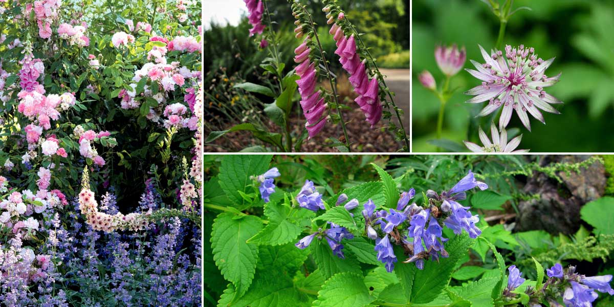 Les népétas peuvent s’intégrer dans un jardin de style romantique, par exemple avec des rosiers et astrances ! Rosier ‘Felicia’, Verbascum et Nepeta (Photo GWI – MBP Plants – MAP) / Digitalis purpurea / Astrantia major ‘Ruby Star’ et Nepeta subsessilis)