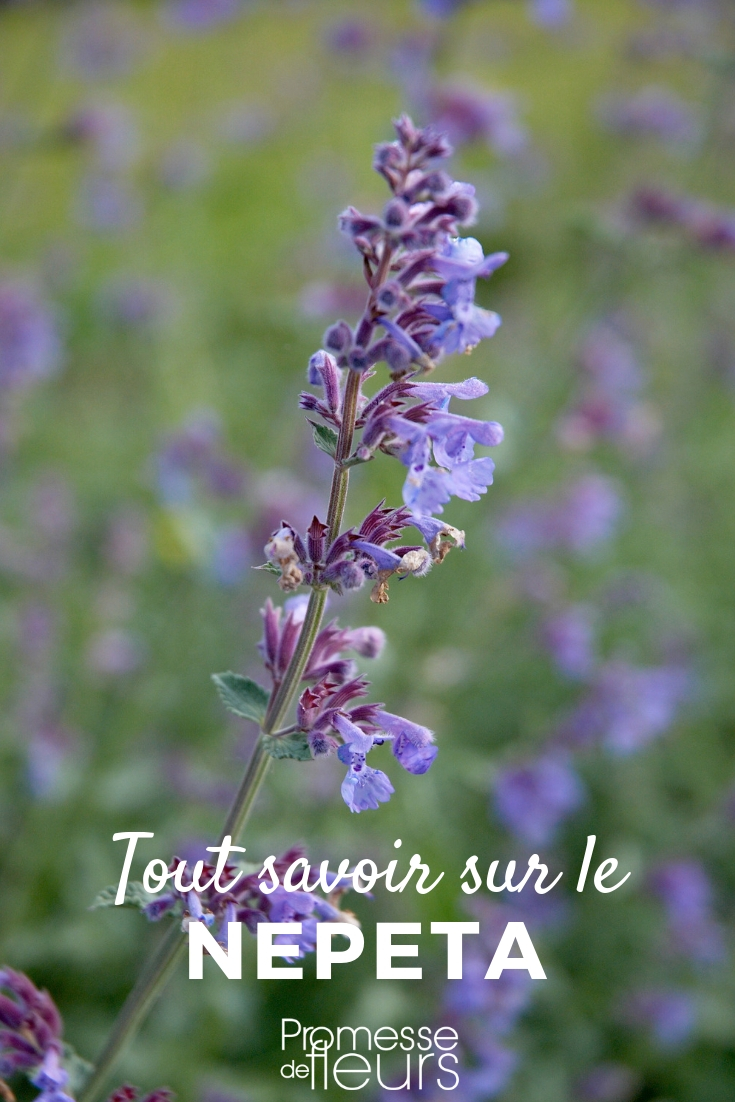 Le népéta possède des fleurs tubulaires, qui se divisent en deux lèvres, et qui sont assez caractéristiques de la famille des Lamiacées. La lèvre supérieure est petite et constituée de deux lobes, tandis que l’inférieure est plus large, bien développée, et compte trois lobes. Le calice comporte cinq dents (cinq sépales soudés). À l’intérieur du tube de la corolle, la fleur possède quatre étamines, qui portent le pollen. La taille des fleurs est assez variable : celles du Nepeta faassenii mesurent moins d’un centimètre de long, tandis que celles du Nepeta ‘Souvenir d’André Chaudron’ mesurent jusqu’à 4 cm de longueur. Lorsqu’ils sont petits, la floraison prend un aspect très vaporeux et léger !