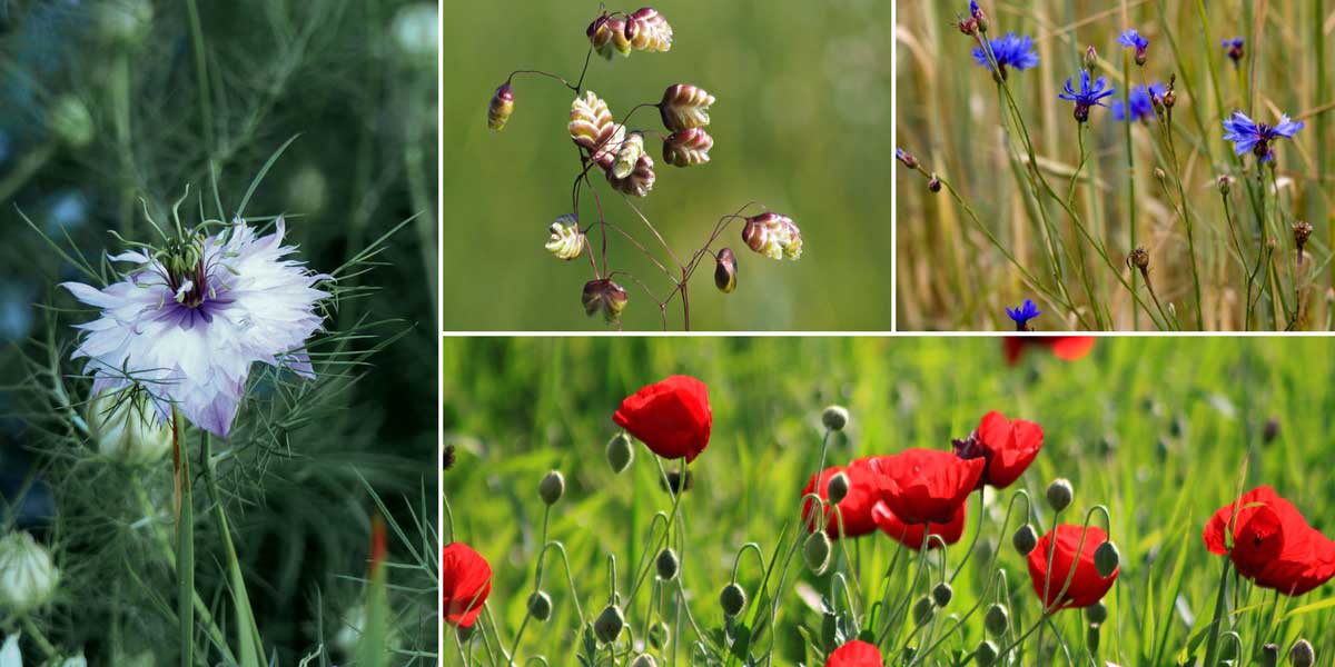 La Nigelle de Damas peut s’associer avec les épis fins de la graminée Briza media (photo Hajotthu), ainsi que des bleuets (photo Tauri Pärna), et coquelicots