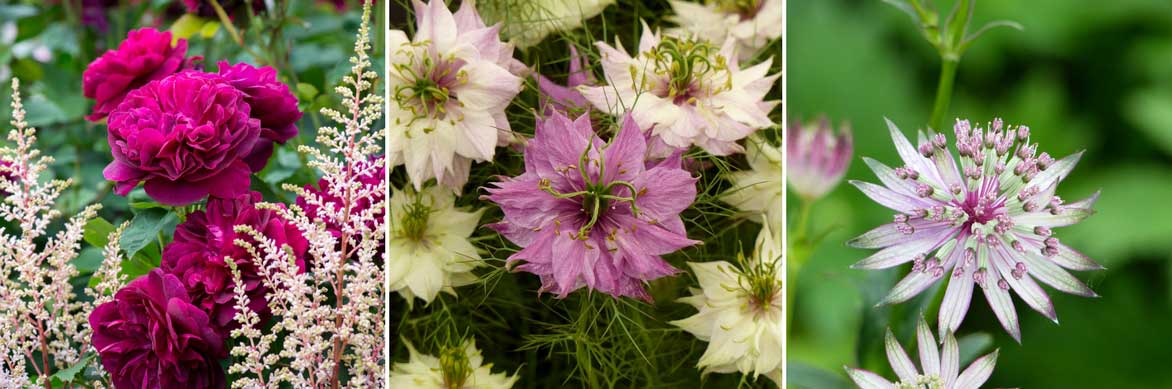 Une idée d’association pour un massif romantique : Rosier ‘Darcey Bussell’ et Astilbe japonica ‘Peach Blossom’ (photo Nicola Stocken – GAP Photos) / Nigelle de Damas ‘Mulberry Rose’ / Astrantia major ‘Ruby Star’