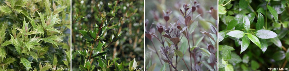 Plusieurs feuillages : Osmanthus heterophyllus ‘Tricolor’, Osmanthus heterophyllus ‘Gulftide’, Osmanthus heterophyllus ‘Purpureus’, Osmanthus heterophyllus ‘Goshiki’
