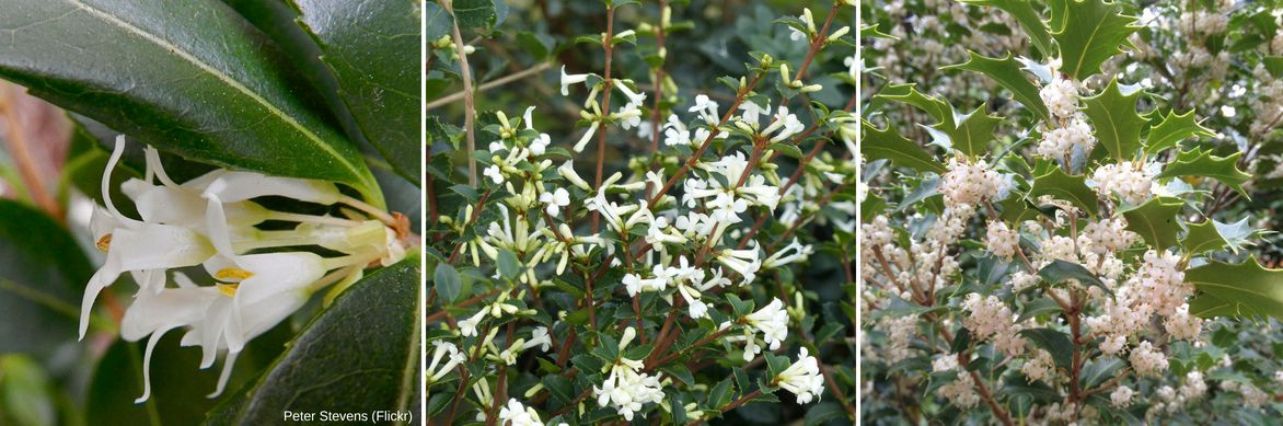 Les fleurs des osmanthes sont très parfumées: Osmanthus burkwoodii, Osmanthus delavayi, Osmanthus heterophyllus ‘Gulftide’.