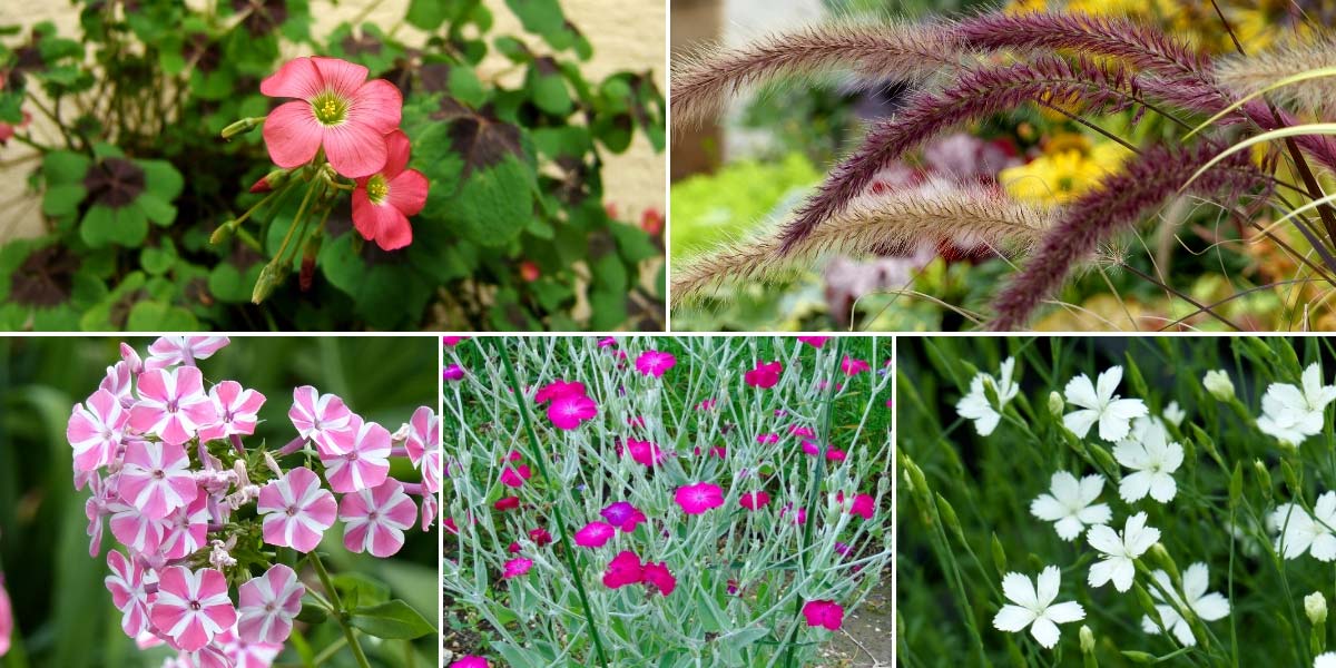 Vous pouvez intégrer les oxalis dans un massif avec d’autres floraisons colorées, et quelques graminées. Oxalis tetraphylla (photo Wildfeuer), Pennisetum setaceum ‘Rubrum’, Phlox paniculata ‘Peppermint Twist’, Lychnis coronaria et Dianthus deltoides ‘Albiflorus’