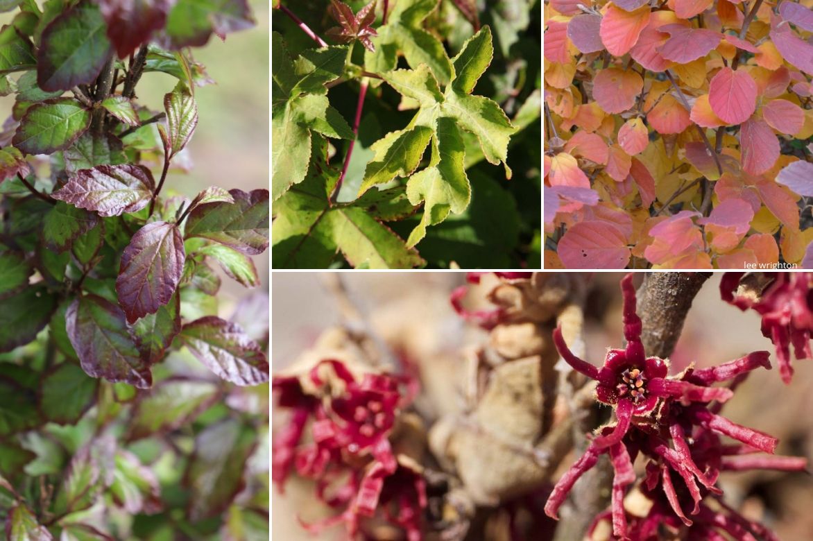 Un exemple d’association en bosquet : Parrotia persica ‘Persian Spire’, Liquidambar styraciflua ‘Gum Ball’ au feuillage automnal incroyable et Fothergilla major auxquels vous pouvez ajouter un Hamamelis à la superbe floraison hivernale comme ‘Amethyst’