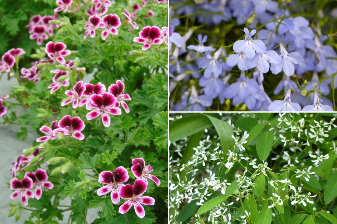 Quelques fleurs : Pelargonium peltatum ‘Big 5 White Angel’, Pelargonium ‘Mosquitaway Eva’, Pelargonium graveolens, Pelargonium cucullatum, Pelargonium ‘Paton’s Unique’ et Pelargonium ‘Wilhelm Langguth’