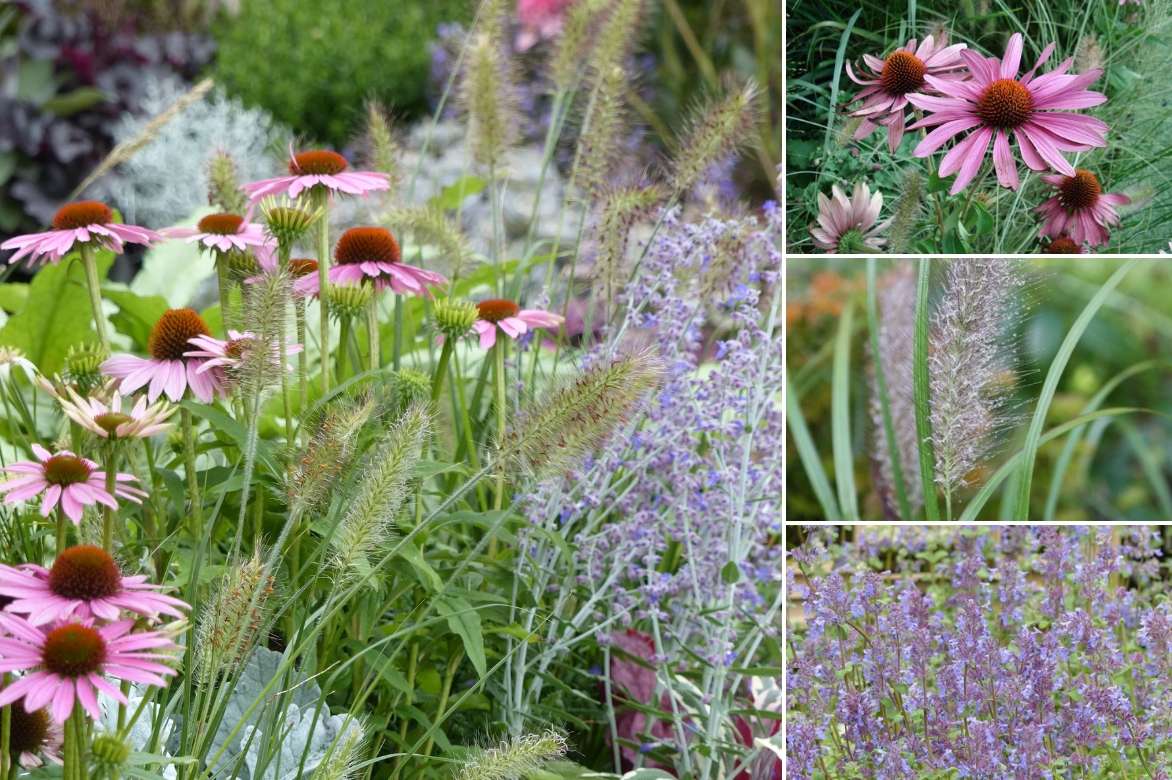 Une idée d’association naturelle : Pennisetum alocuperoides ‘Hameln’, Echinacea purpurea et Nepeta faassenii ‘Six Hill’s Giant’.