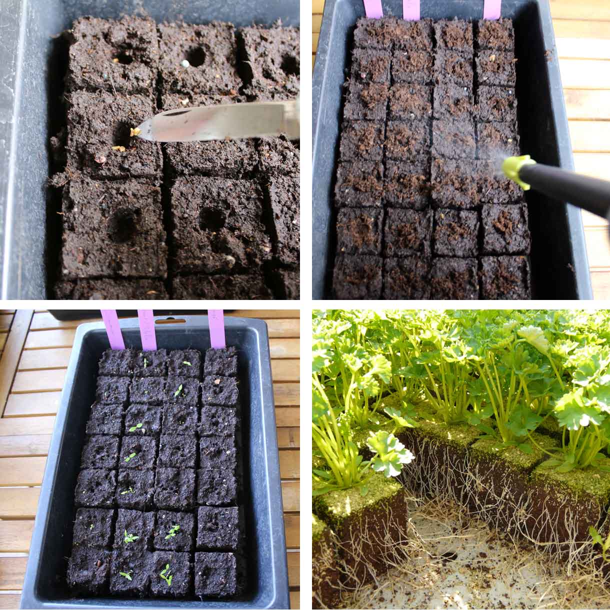 Semis de persil en mini-mottes : 1) les graines sont imbibées une dans de l’eau avant d’être semées – 2) les mini-mottes sont pulvérisées – 3) le début de la levée à lieu au bout de 8 jours seulement – 4) quelques semaines plus tard le persil est prêt à être repiqué au jardin