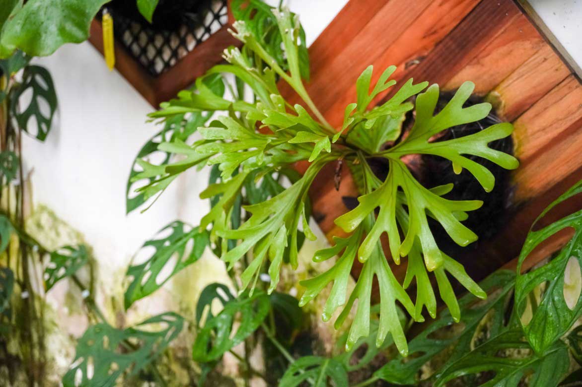 Le Platycerium crée facilement un effet très exotique sur un mur, comme ici en association avec des Monsteras
