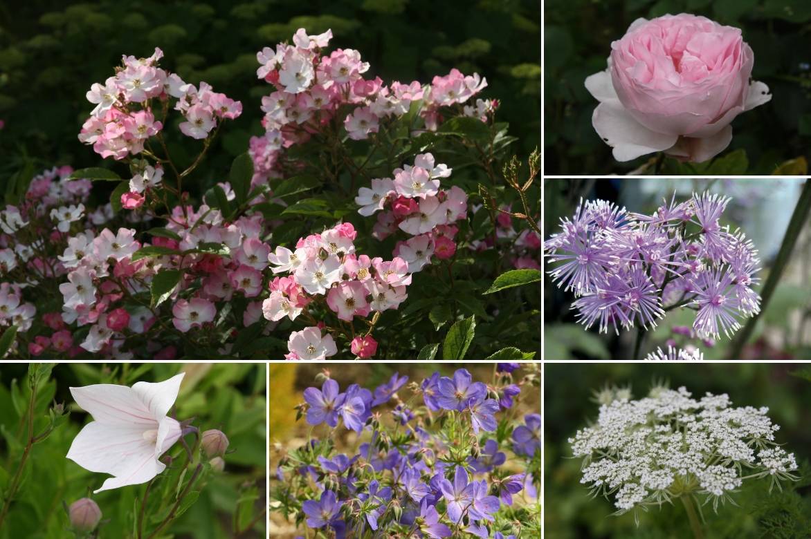 Un exemple d’association : Rosier ‘Ballerina’, Rosier ‘Scepter’d Isle’, Thalictrum actaefolium ‘Perfume Star’, Selinum wallichianum, Geranium ‘Johnson’s Blue’, Platycodon grandiflorus ‘Perlmutterschale’