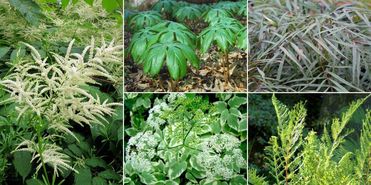 Intégrez le Podophyllum dans un jardin naturaliste de sous-bois. Aruncus dioicus, Podophyllum peltatum (photo Valis55), Mahonia ‘Soft Caress’, Aegopodium podagraria ‘Variegata’, et Athyrium filix-femina ‘Lady in Red’