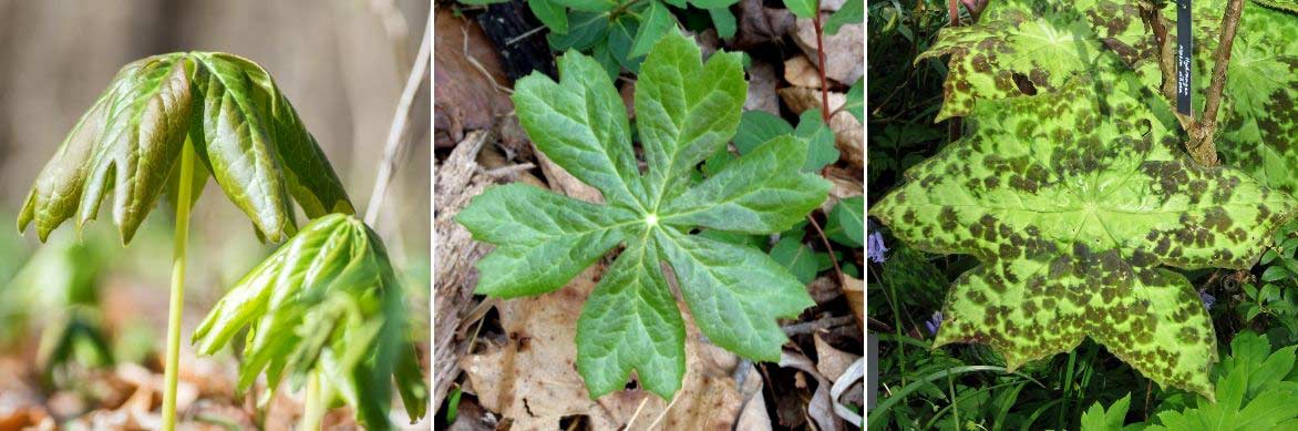 Le feuillage original du Podophyllum ! Ici, Podophyllum peltatum (photos : Andrew Cannizzaro / Katja Schulz), et Podophyllum ‘Spotty Dotty’ (photo peganum)