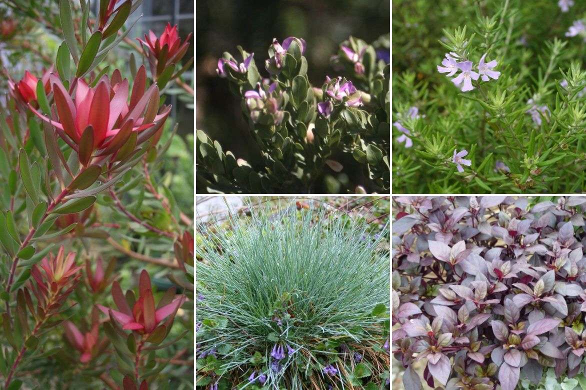 Une idée d’association en climat doux : Leucadendron (‘Fireglow’ ou ‘Safari Sunset’ par exemple), Polygala myrtifolia, Westringia fruticosa, Festuca glauca et Alternanthera ‘Little Prince’ ou ‘Purple Night’. Un palmier bleu du mexique (Brahea armata) serait parfait aussi
