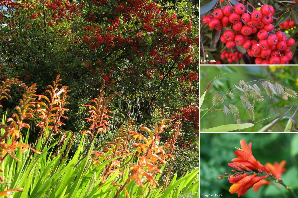 Un exemple d’association : Pyracantha rouge (la variété ‘Coccinea Red Column’ est un beau sujet aux baies rouge écarlate), Chasmanthium latifolium et Croscosmia ‘Lucifer’.