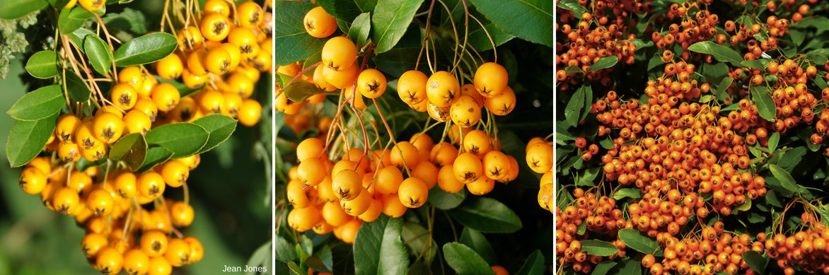 Les baies de Pyracanthas sont très décoratives et font le régal des oiseaux : P. ‘Soleil d’Or’, P. ‘Golden Charmer’, P. ‘Orange Glow’.