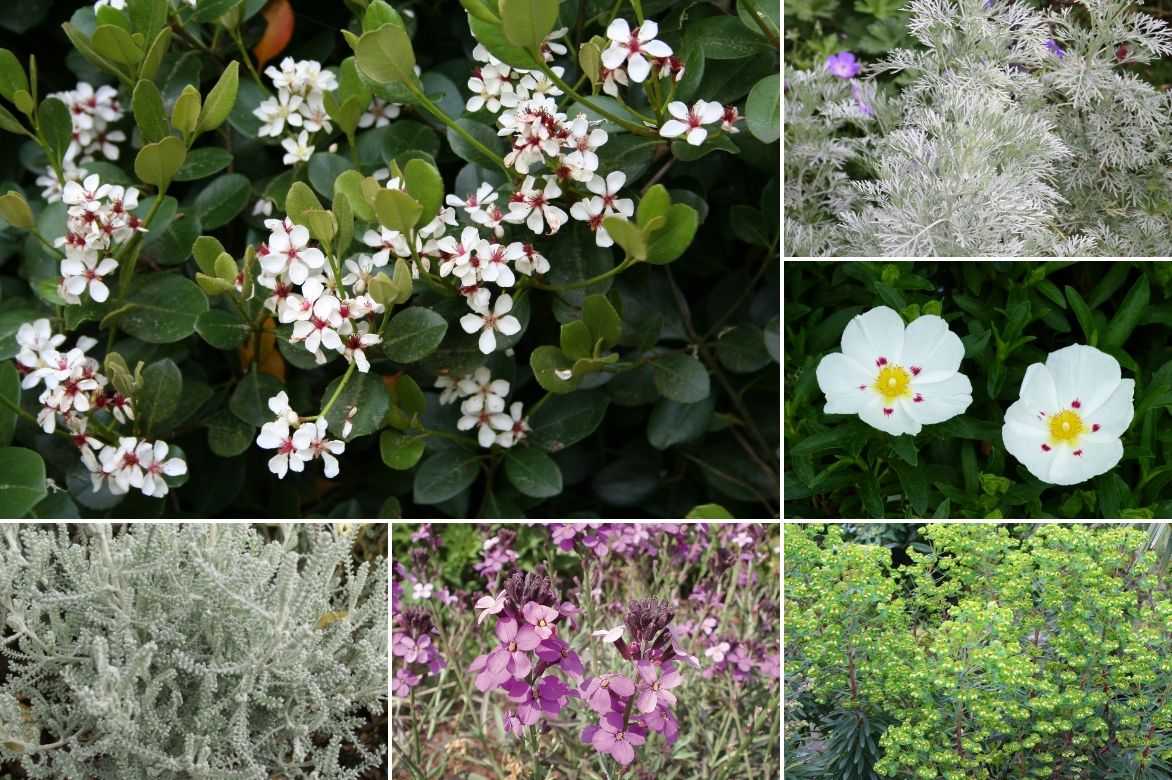 Une idée d’association au soleil, en terre très bien drainée : Raphiolepis ovata, Artemisia arborescens ‘Powis Castle’, Cistus x loretii, Euphorbia martinii, Erysinum Bowl’s Mauve et Santolina chamaecyparis