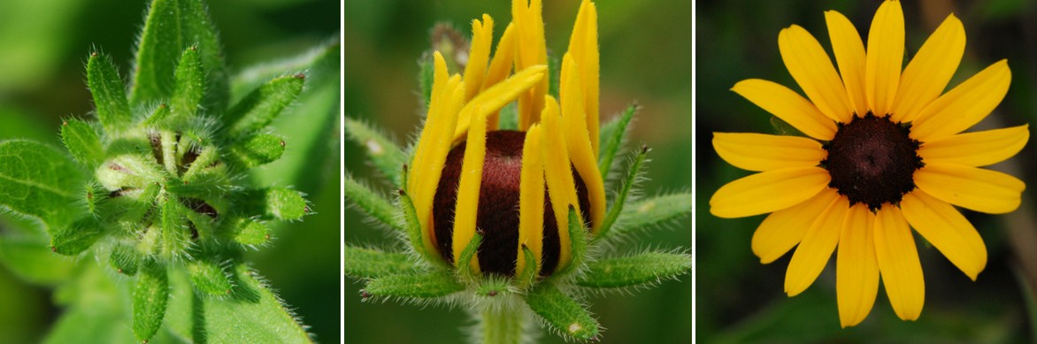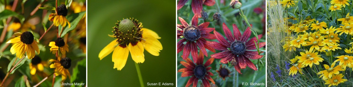 Plusieurs formes et couleurs : Rudbeckia triloba, Rudbeckia amplexicaulis, Rudbeckia ‘Cherry Brandy’, Rudbeckia hirta ‘Prairie Sun’.
