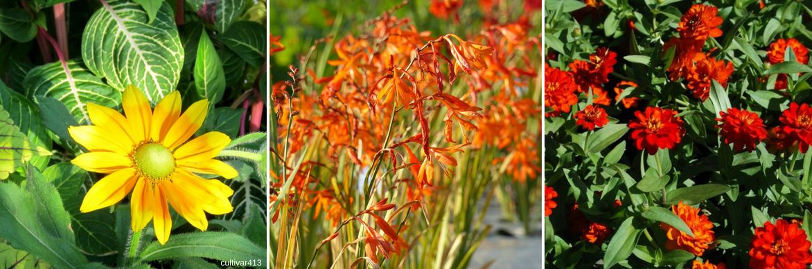 Une idée d’association aux couleurs chaudes : Rudbeckia hirta ‘Prairie Sun’, Crocosmia et Zinnia ‘Profusion Double Fire’.