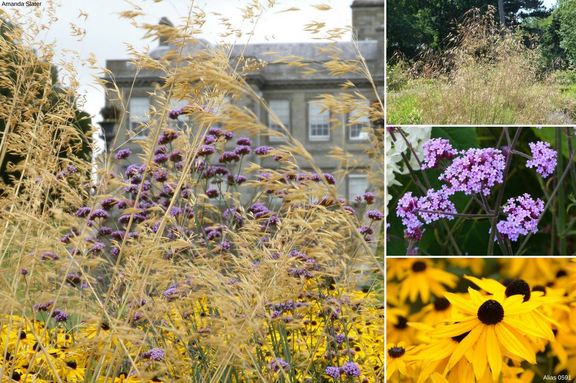 Une toile de fond composée par des graminées panachées de jaune comme les Miscanthus apporteront le flou et le mouvement en contrepoint du port un peu raide des Rudbeckias.