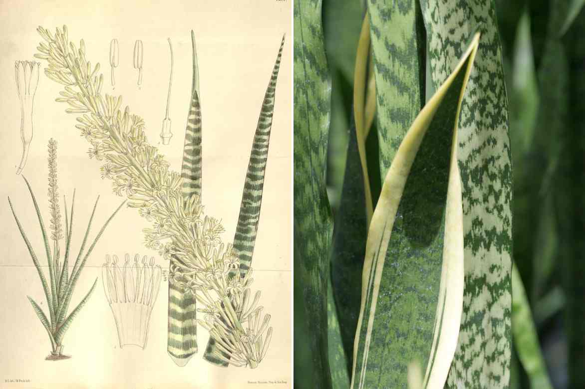 Planche botanique : Sansevieria roxburghiana, et à droite le feuillage remarquable de l’espèce courante, Sansevieria trifasciata