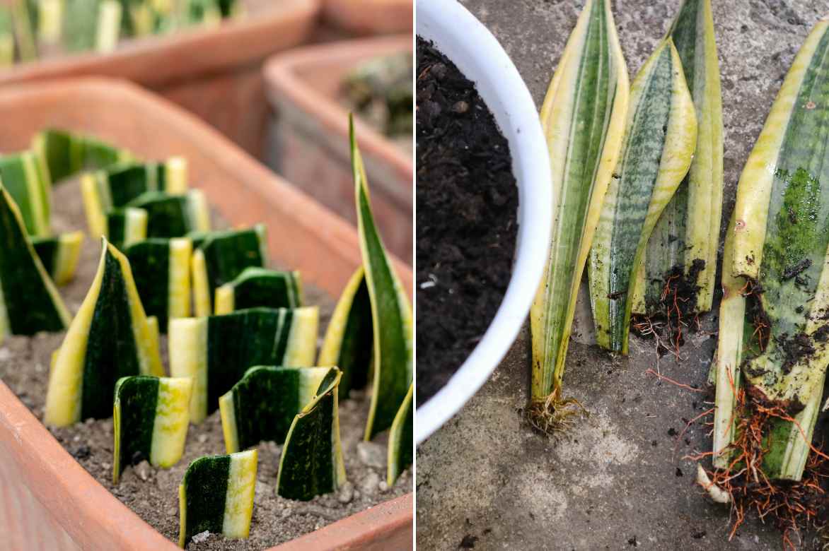 - Planter verticalement les segments dans un substrat léger et drainant (terreau universel allégé de sable ou de perlite), en respectant le sens de la feuille (base en bas).